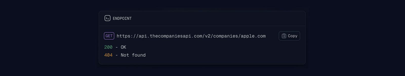 const company = response.data // The company profileWhat you get, over 50 datapoints (see all datapoints) including: